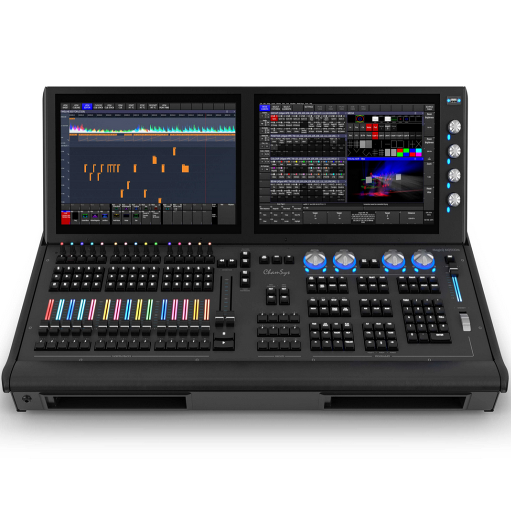 The ChamSys MagicQ MQ500M Stadium offers the highest level of show control, supporting 256 universes directly from the console without need for external processors. RGB illuminated, fully motorised faders and encoders provide 42 playbacks, along with backlit keys for upgraded programming. MQ500 Stadium features dual HD resolution multi touch 15” displays with adjustable viewing angle and multi touch gesture support. It has the largest number of playbacks in the ChamSys family, with 42 playbacks made up of both fader and executor playbacks for live busking. This includes 15 full faders, 15 executable playbacks, and a dedicated section of 12 multipurpose Macro/Execute/Playbacks/Palette keys. For additional control connect a MagicQ Stadium Wing and get even more playbacks and another touchscreen display as well. The MQ500 Stadium has inbuilt MagicVis 3D visualizer with high quality beam and gobo rendering. This means you can preprogram a new song or create new effects offline, and save time onsite. The MQ500 Stadium has 4 built-in DMX ports and inbuilt 4 port Ethernet switch. This versatile console also includes an intensity wheel and 100mm split crossfaders for theatre control.