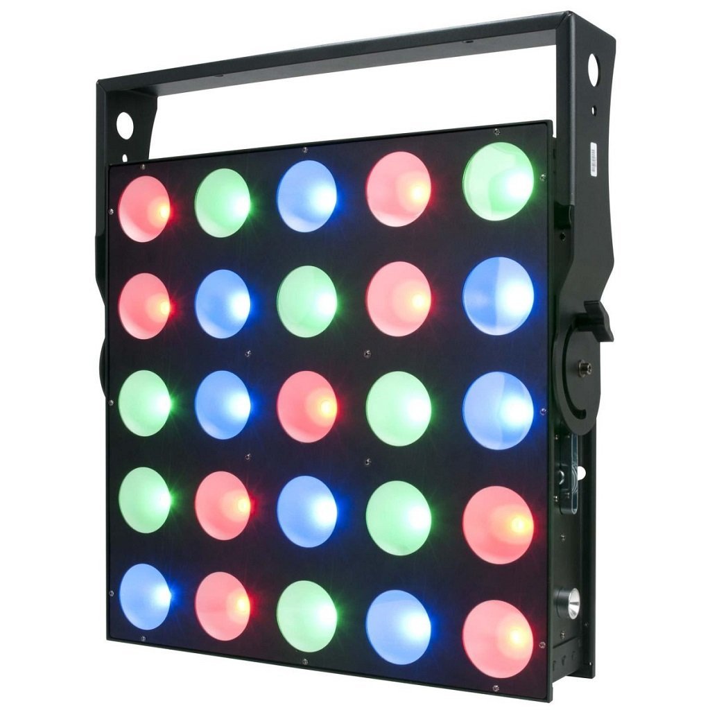 The Elation Cuepix Panel 5 features (25) long life 30W 3-in-1 RGB COB LEDs, a 60° beam angle, RDM (Remote Device Management), individual control of each COB module, variable / selectable dimming curves, strobe and zone chase effects, flicker free operation for TV and Film, ArtNet™, KlingNet™ and RDM (remote device management) protocol support, 3pin and 5pin DMX and powerCon in/out connections, LCD menu display with 4 button control panel, integrated rigging points and optional rigging bracket available, and a multi-voltage universal auto switching power supply (100-250v).