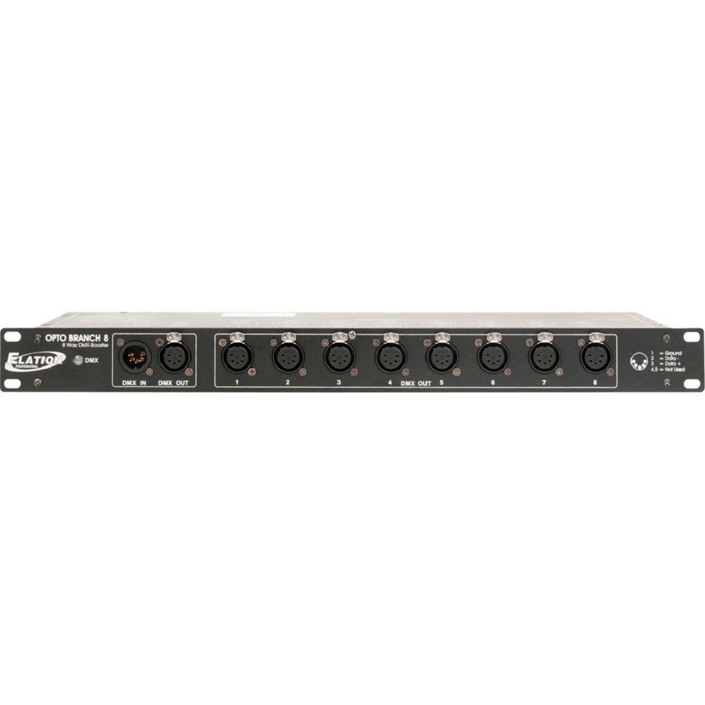 The Elation Opto Branch 8 is a 19” single rack space, 8-way DMX distributor/booster with 5pin XLR input and output jacks. This unit takes the incoming DMX signal and splits it to eight (8) separate outputs, each providing a total electrical isolation of up to 1000V between different branches in a daisy chain group. This greatly decreases problems with ground loops and efficiently buffers and magnifies the DMX signal, making it more accurate and reliable. All outputs include 5pin XLR sockets, which are electronically isolated from each other to ensure uninterrupted data. In addition, each output has dedicated drivers to boost the incoming signal and the unit includes an auto switching power supply (100-240v 50/60Hz). We offer both individual unit rentals as well as rack mounted options.